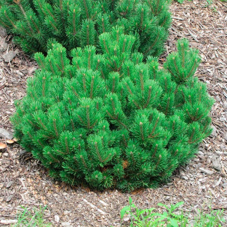 Молодой росток сосны горной (до 20 см в высоту). Этот вид представляет собой обширный кустарник с раскидистыми ветвями и длинными иглами, который в условиях культивирования может достигать высоты до пяти метров. Ветви имеют характерную коленчатую форму. Шишки у сосны горной симметричные, могут располагаться непосредственно на ветках или на коротких стебельках, и никогда не покрываются инеем. К осени первого года они приобретают желто-коричневый оттенок, а по мере созревания становятся цвета корицы. Чешуйки на шишках одинаковы по размеру и форме.